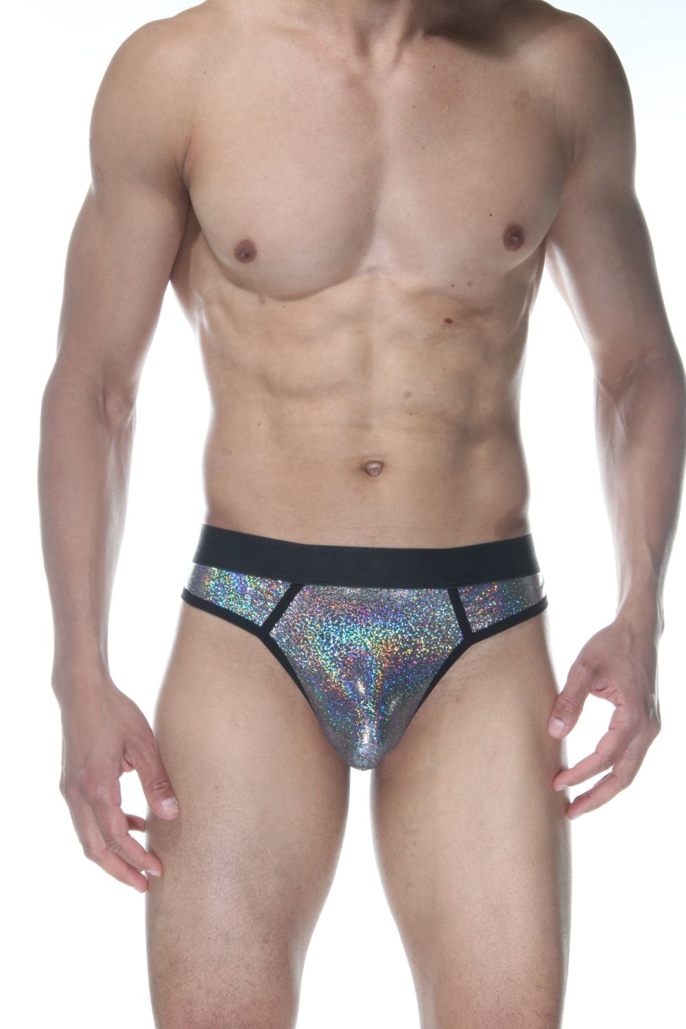 Серебристые блестящие мужские трусы-стринги.